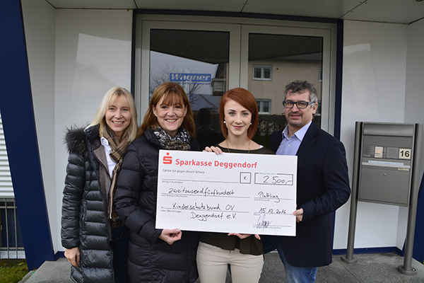 SpendenübergabePlattling. Getreu dem Motto „Spende statt Geschenke“ hat die Firma Wagner Maschinenbau auf die Tradition, kleine Weihnachtsgeschenke an Kunden und Lieferanten zu versenden, verzichtet und stattdessen 2500 Euro an den Kinderschutzbund Deggendorf gespendet. Bei der Scheckübergabe an stellvertretende Vorsitzende Gerti Iglhaut (l.) und Sylvia Jaensch (2.v.l.) von der Außenstelle Plattling am Donnerstag stellte Wagner-Geschäftsleiter Franz Greipl (r.) fest: „Die Spende landet definitiv an der richtigen Stelle.“ Wichtig war für ihn und Christina Wagner, dass die Spende in der Region ankomme und an hilfsbedürftige Kinder und deren Familien gehe. Der Kinderschutzbund engagiert sich seit Jahren, dass sozial benachteiligte Kinder genauso sorglos wie andere Kinder aufwachsen können und nicht durch Ausgrenzungen ins Abseits geraten. „Spende statt Geschenke“ ist ein Weg, den die Firma Wagner auch in Zukunft gehen möchte, erklärte Greipl.